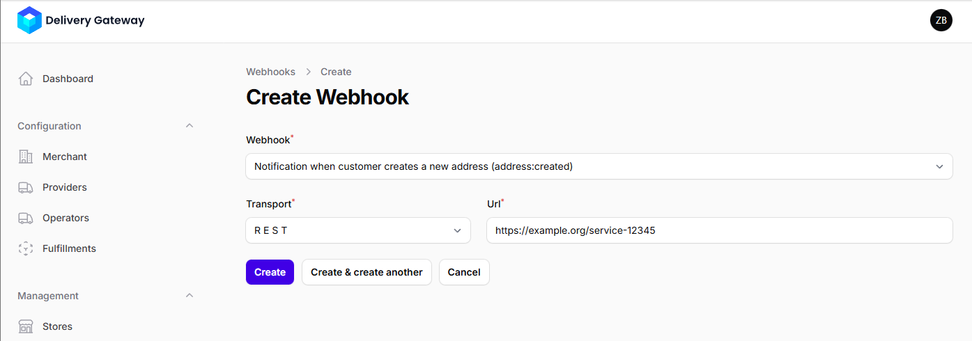 Webhooks allow you to send notifications of Delivery Gateway events to a third-party service. For example, you can set up a webhook to send an event notification when a shipment is created or when a customer updates their address.