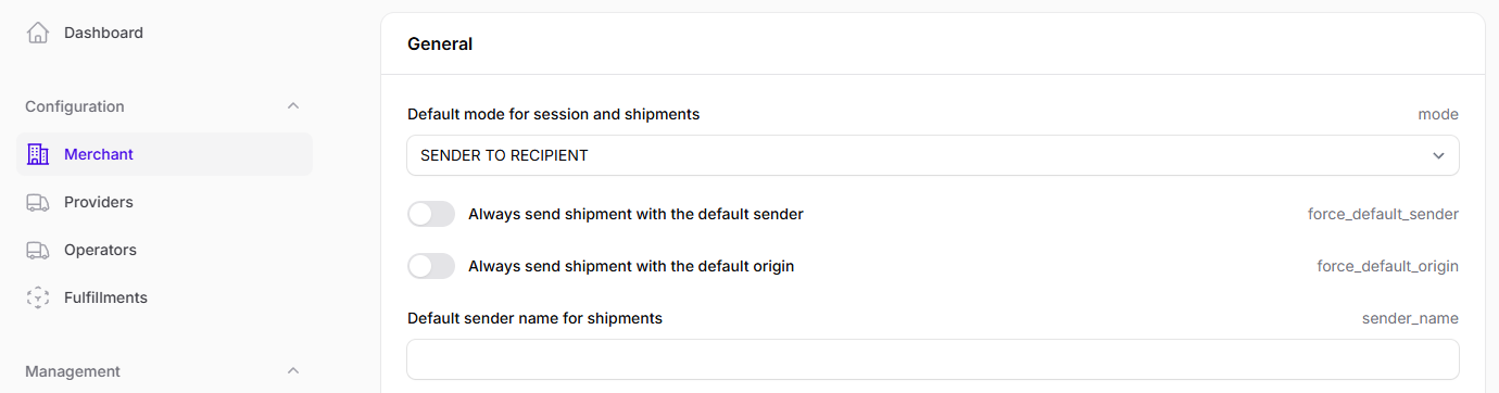 On the Delivery Gateway Admin Dashboard, you can configure the default shipment mode: this mode will be used for all shipments unless otherwise specified by the Merchant API.